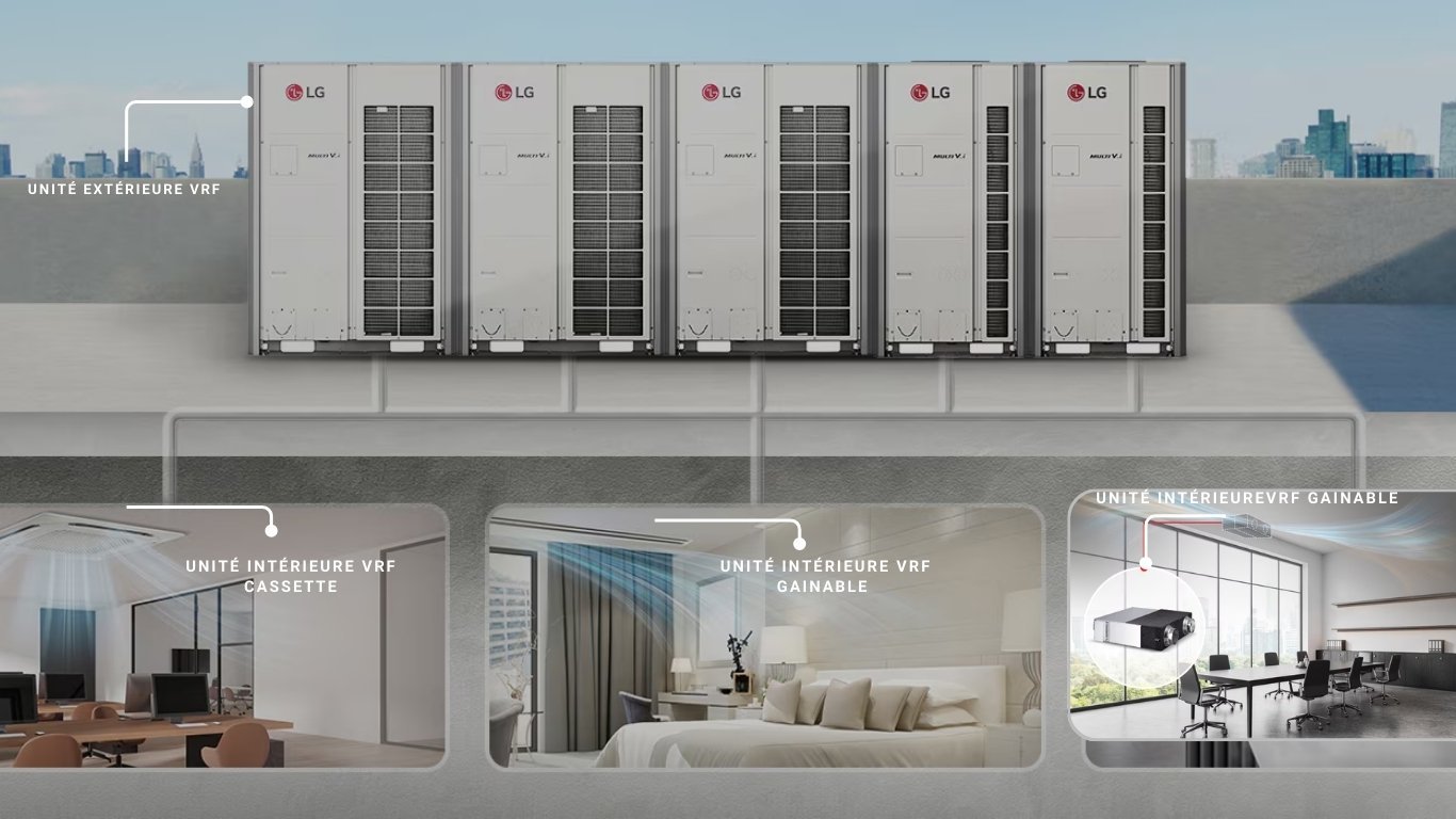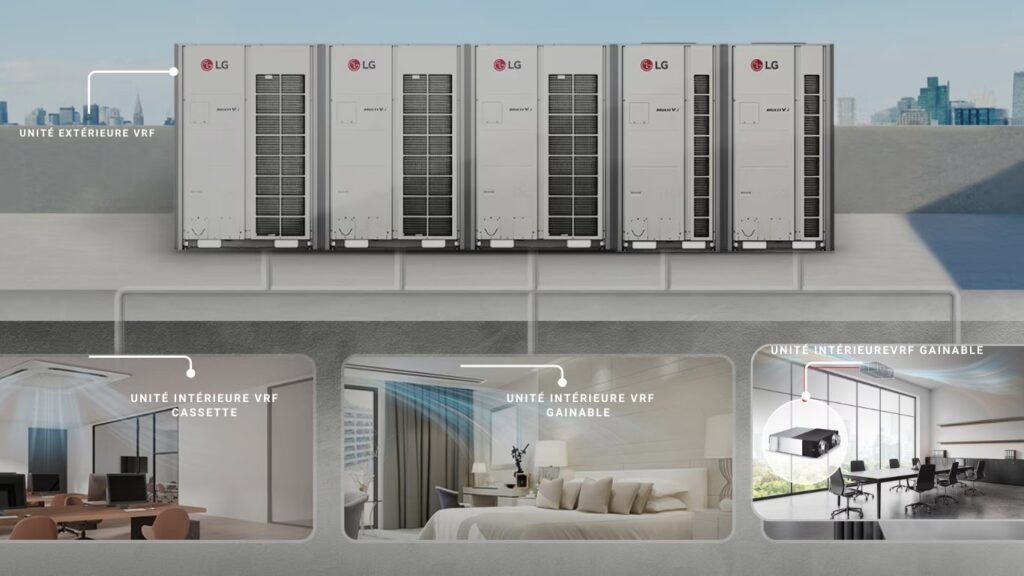 Un système de climatisation centralisé (VRF) est préférable pour garantir l’efficacité énergétique et la distribution efficace de l’air.